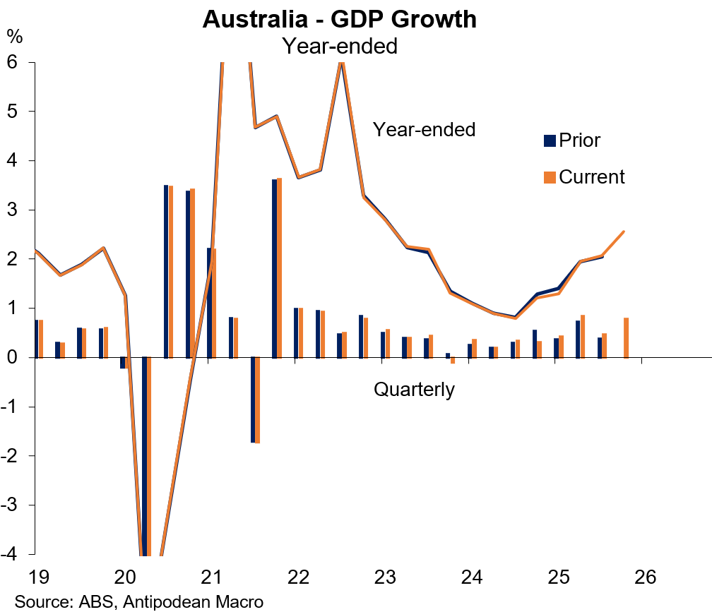 Quarterly GDP growth was softer than our final nowcast of +1.0% q/q but upward revisions to growth in recent quarters meant that year-ended growth was a bit stronger than our +2.5% y/y nowcast.