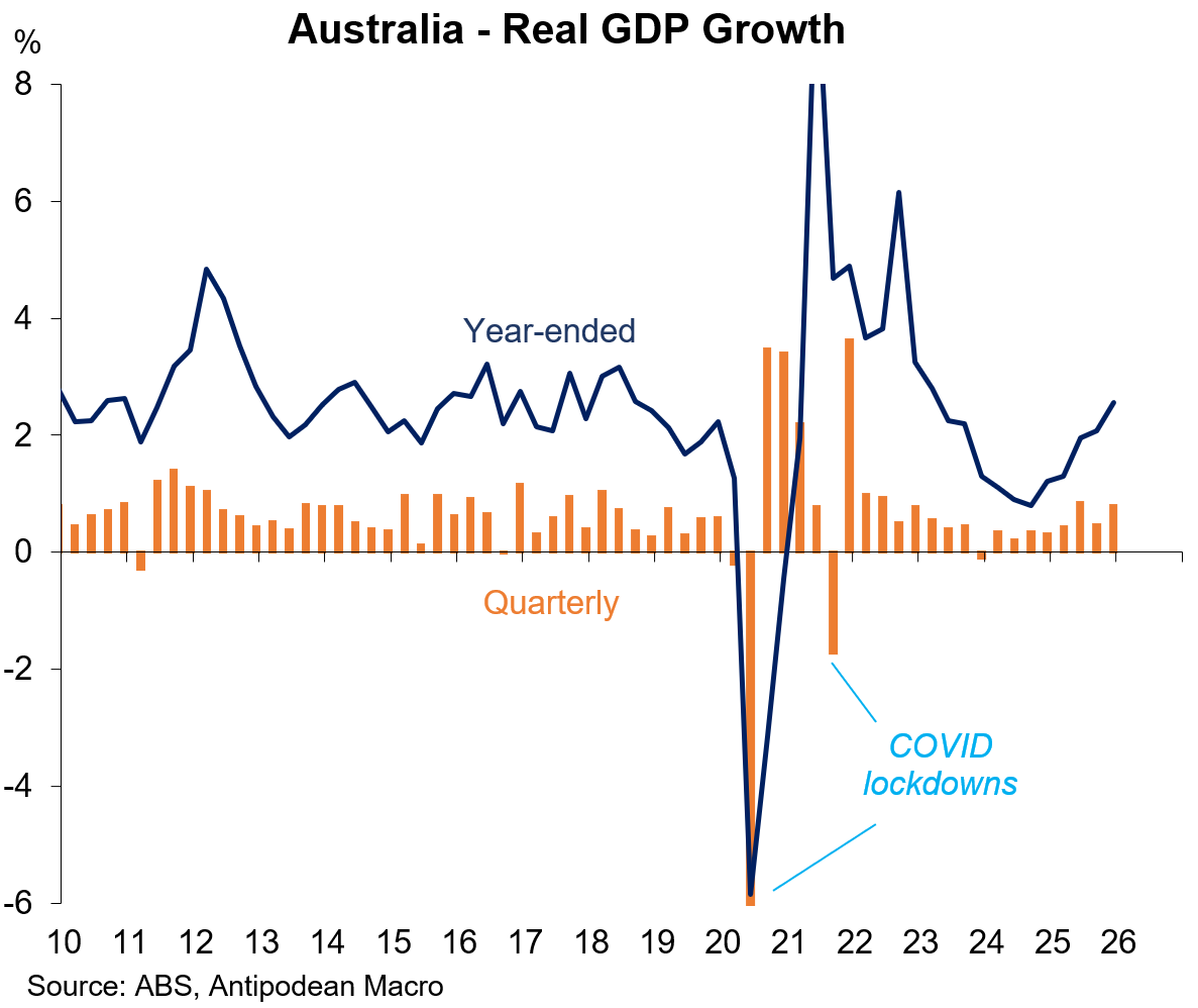 1. Australia’s GDP rose +0.8% q/q and +2.6% y/y in Q4 2025. This is faster than annual potential growth of ~2% and is consistent with the recent modest fall in the unemployment rate and increase in firms’ reported capacity utilisation over H2 2025.