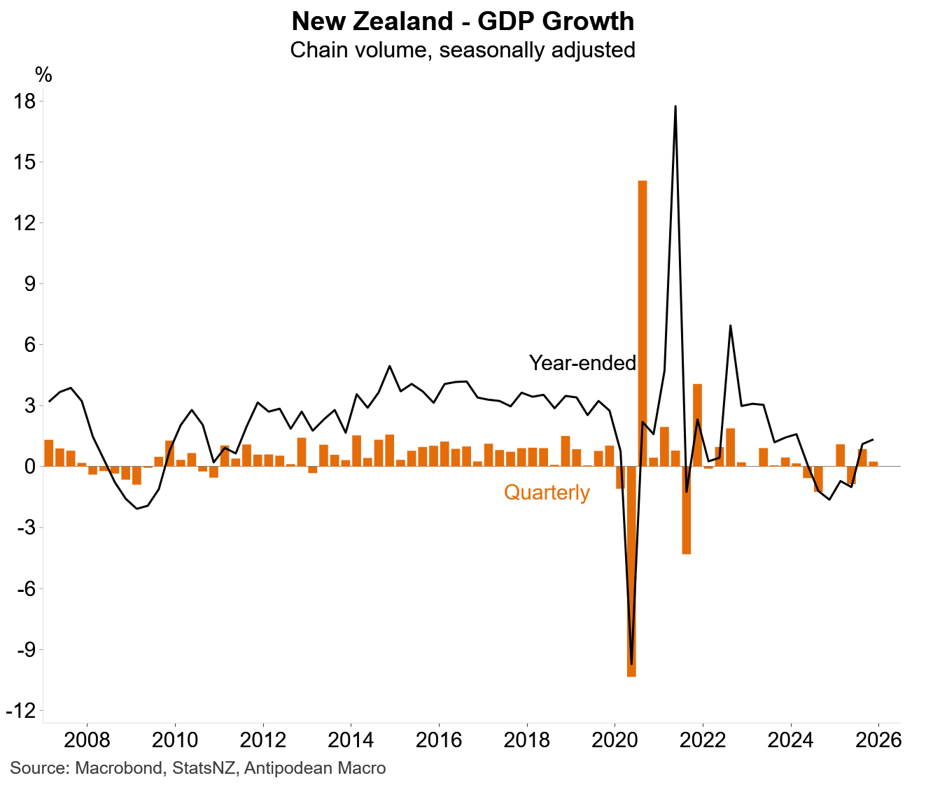 1. New Zealand’s Q4 GDP rose +0.25% q/q following downwardly revised growth of +0.9% q/q in Q3. GDP rose +1.3% on a year-ended basis.