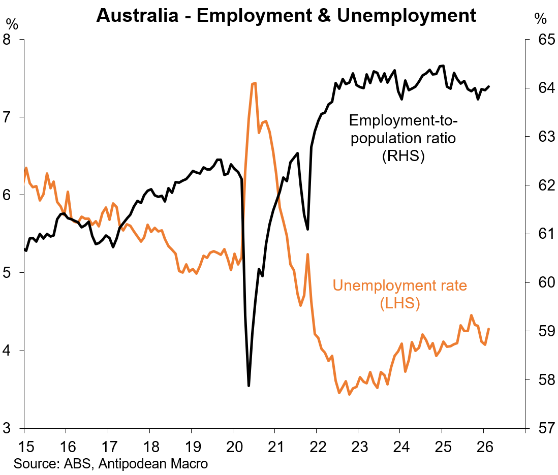 1. Australia’s unemployment rate rose +0.2ppts to 4.3% in February (in unrounded terms it rose from 4.07% to 4.28%).