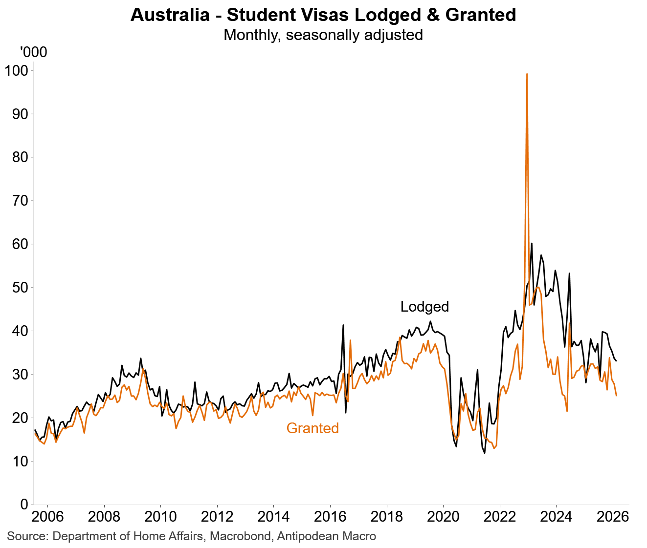 1. The number of student visa applications lodged and granted in Australia has fallen in recent months (latest is February).