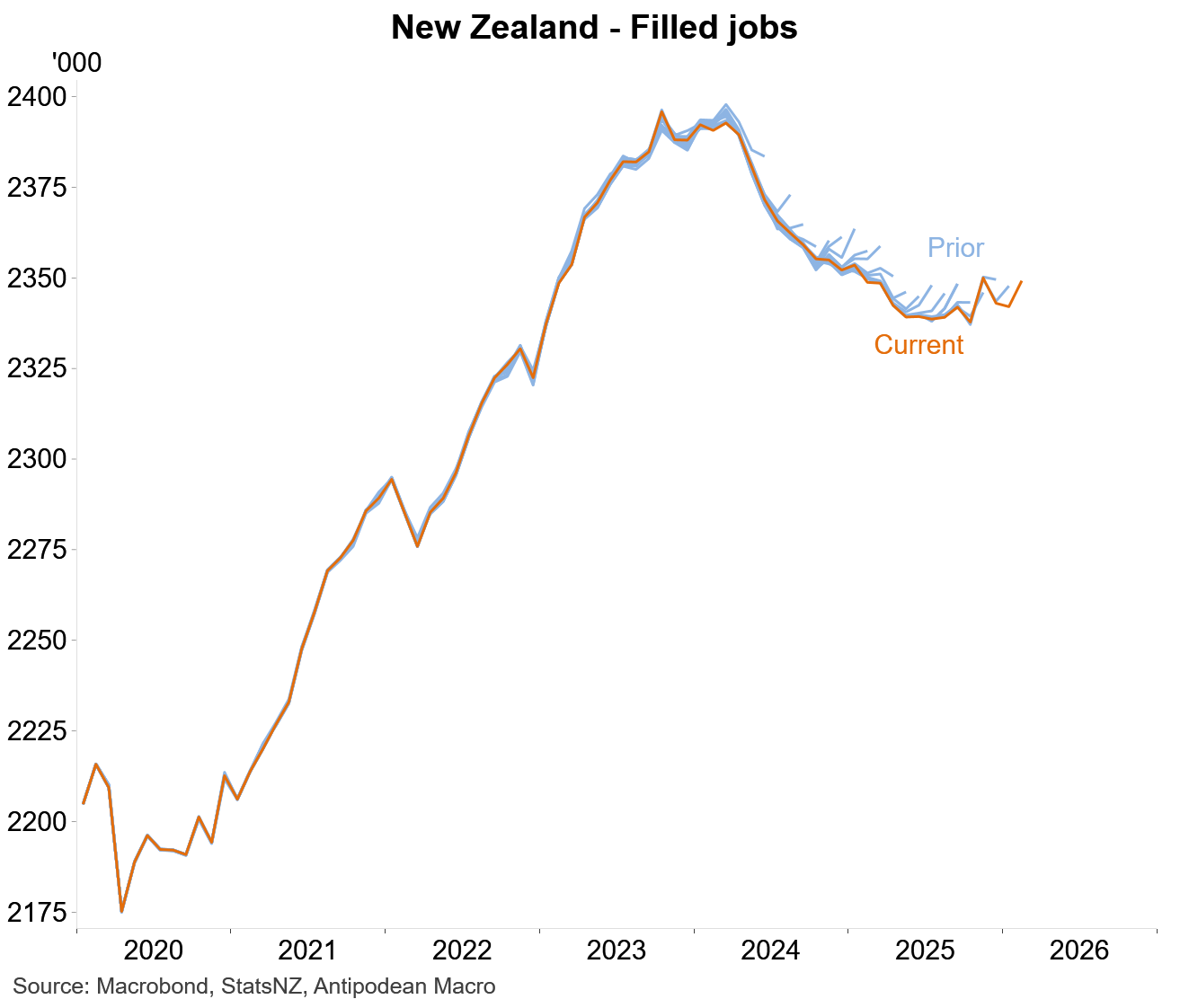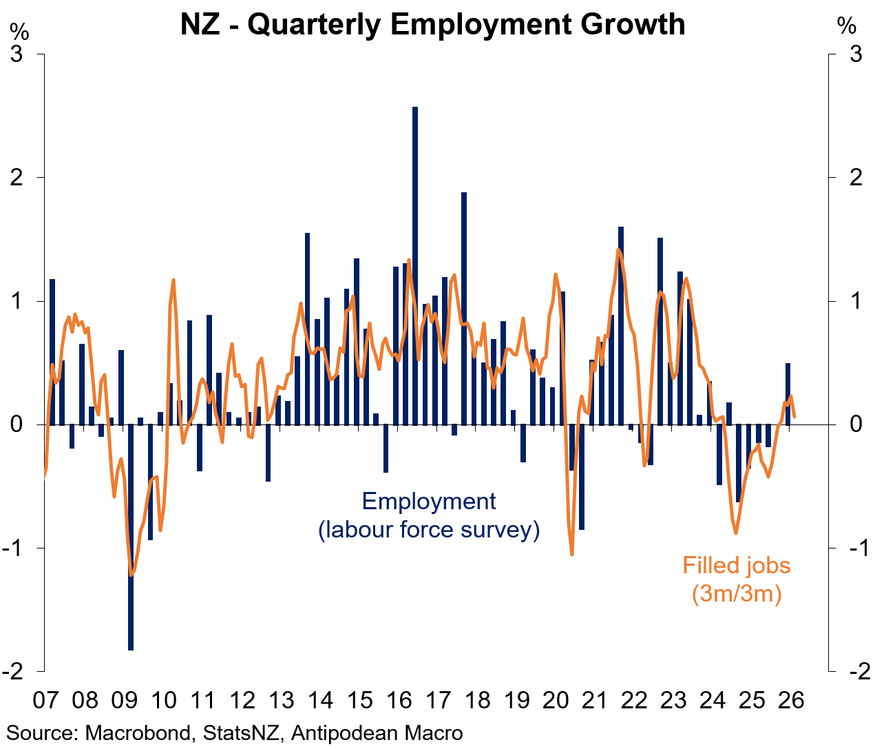 1. Initial estimates suggest that the number of filled jobs in New Zealand rose +0.3% m/m in February. While downward revisions to initial estimates largely continue, there appears to be a gentle rising trend in jobs growth.