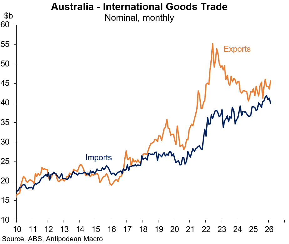 2. Australia’s resources exports (ex gold) fell 4.1% m/m in February to the lowest level since February 2021. In contrast, non-monetary gold exports jumped almost 30% m/m to a new record (the gold price fell 2.6% m/m in A$ terms in February).