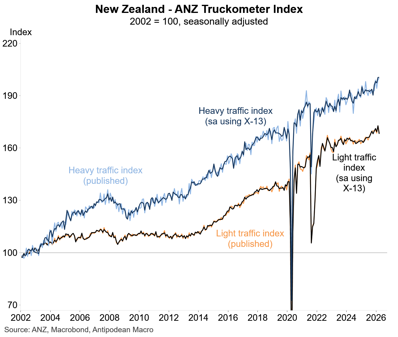 1. ANZ’s New Zealand Truckometer index declined noticeably in March for light vehicles, possibly due to reduce travel amid higher fuel prices.