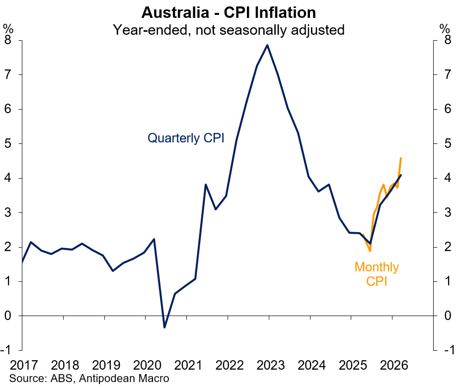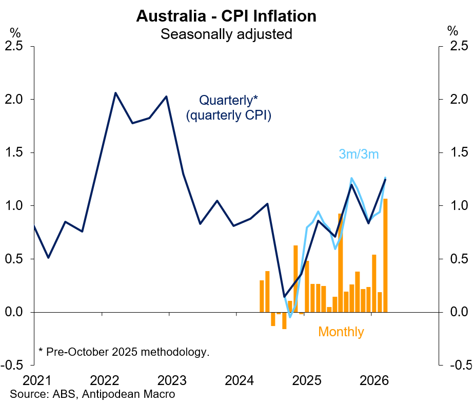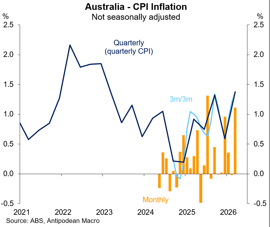 Today’s Aussie CPI confirmed that underlying inflation remained robust in early 2026. While quarterly trimmed mean inflation of +0.8% q/q was a bit softer than expected, prior revisions meant it was in line with the RBA’s forecast in year-ended terms.