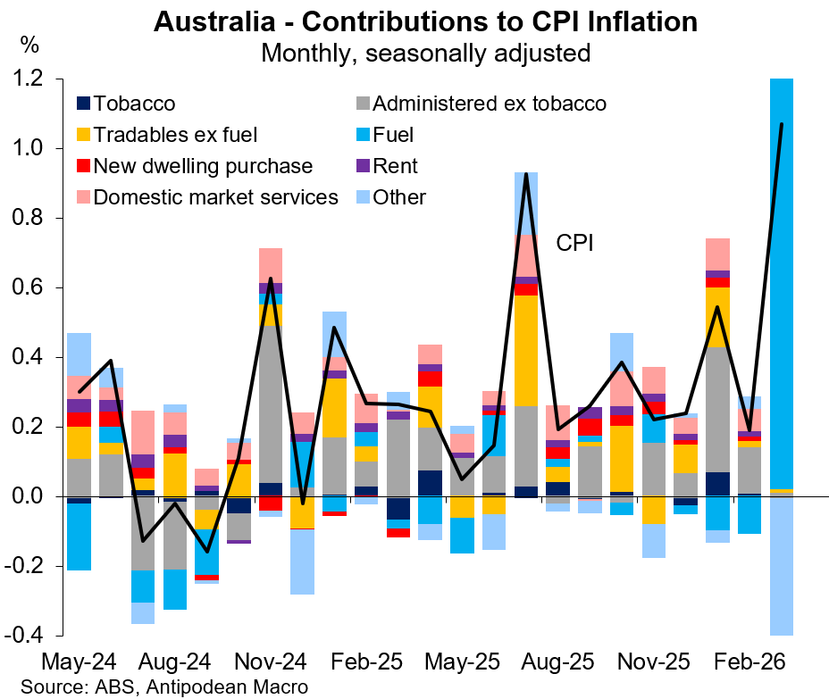As expected, automotive fuel (+33% m/m) contributed 1ppt to monthly headline inflation in March. The main downside surprise relative to our nowcast was the volatile holiday travel & accommodation category (-1.4% m/m).