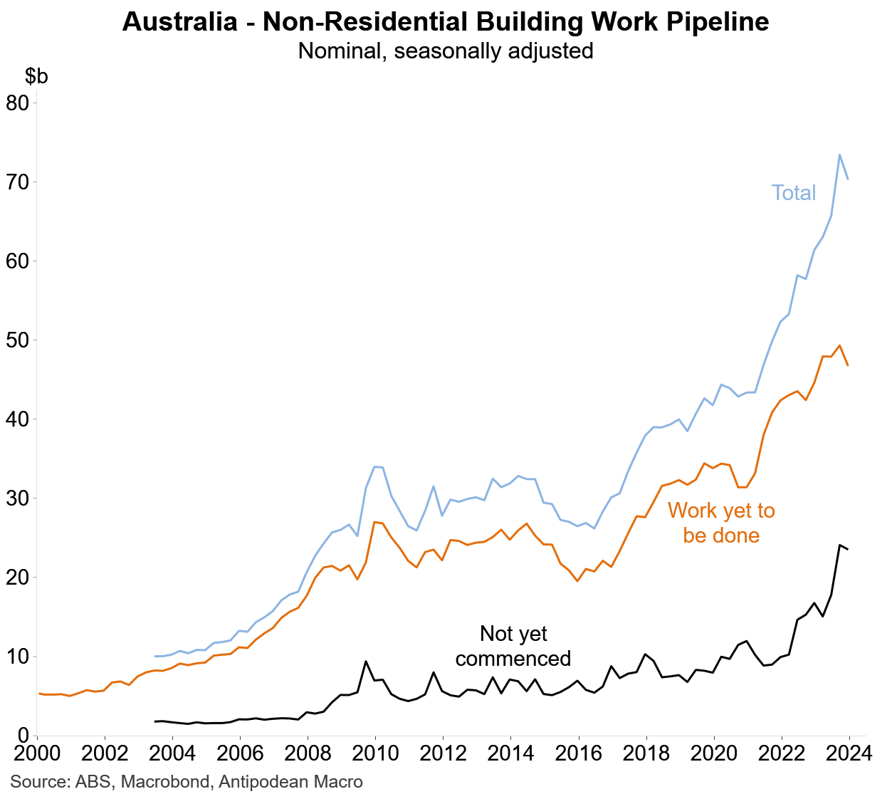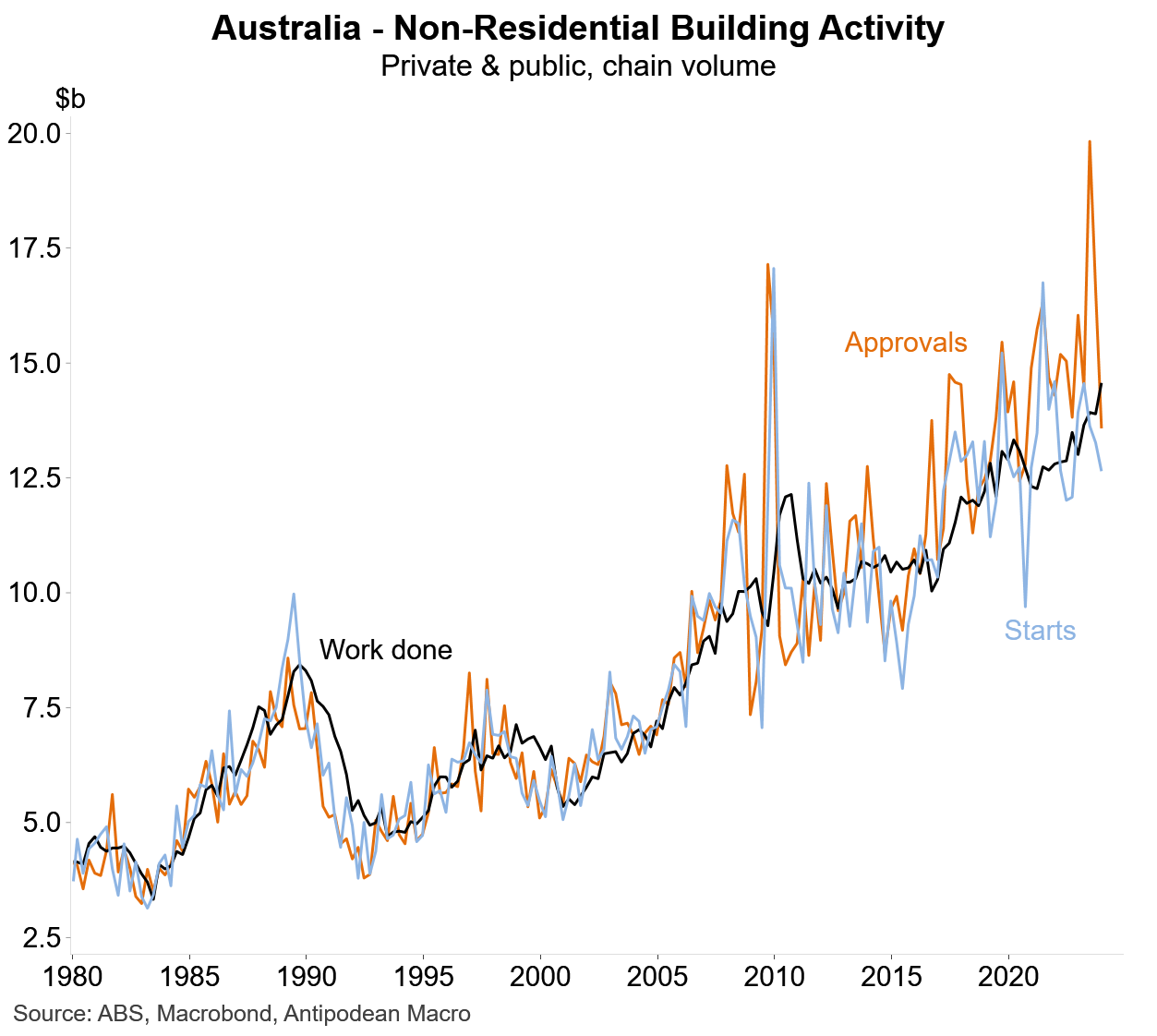 5. Non-residential building starts have noticeably lagged approvals in Australia in recent years (another sign of capacity constraints).