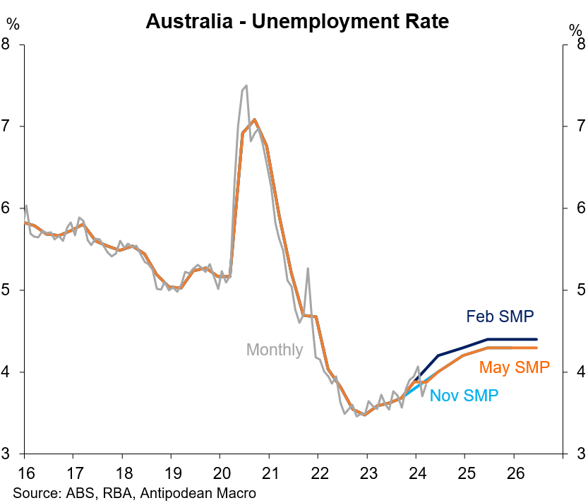3. The Bank has not only aligned its near-term unemployment rate forecasts with the recent lower-than-expected outcomes but has shifted the whole forecast profile back to where it was in November.