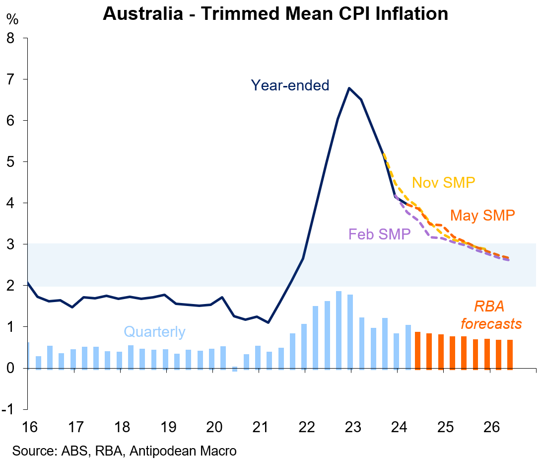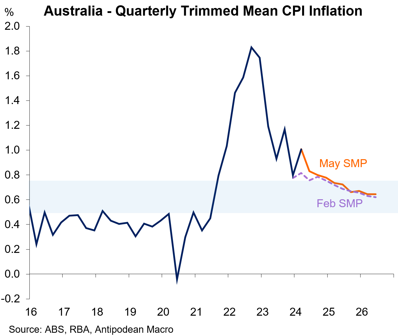 1. The RBA has slightly revised up its trimmed mean inflation forecasts across the forecast horizon. The Bank is still forecasting annualised underlying inflation around the mid-point of the 2-3% target by mid-2026 (it’d be a surprise if it wasn’t!!).