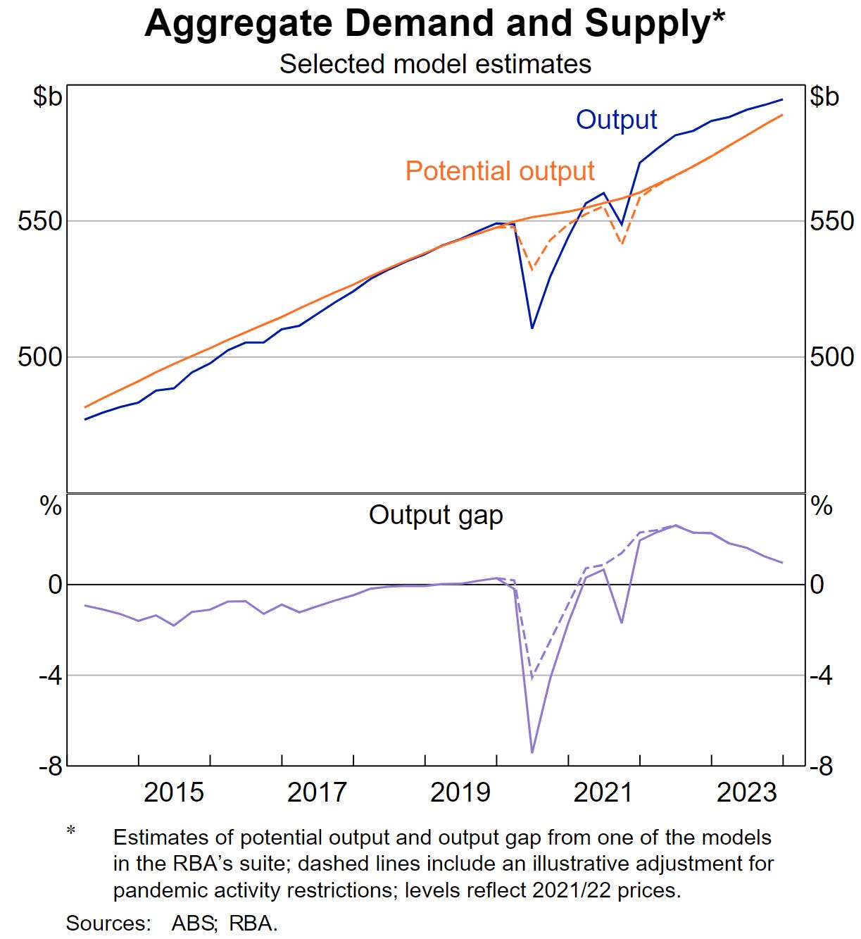 6. The Bank outlined how it measures and thinks about “potential” output. It chose to use the chart below, noting that it’s from one of the models in the RBA’s suite. But it chose this one, and it shows that output is forecast to remain above potential over the entire forecast horizon.
